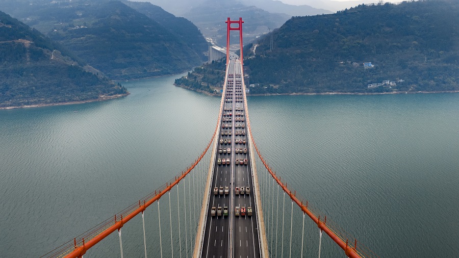 据悉,复兴长江大桥是江龙高速最大的控制性工程,也是长江上游主径跨度最大的悬索桥,其设计长度为左幅1543米、右幅1503米,桥面宽度41.1米,设双向六车道+应急车道+人行道。江龙高速建成通车后,将大幅缩短云阳城区与龙缸等核心景区的距离,车程将由原来的2小时缩短至约40分钟,同时,该线路有效串联红池坝等沿线旅游资源,将惠及渝东北中部区域约200万群众的出行,对完善区域路网、促进交旅融合,推动沿线乡镇乡村振兴具有重要意义。